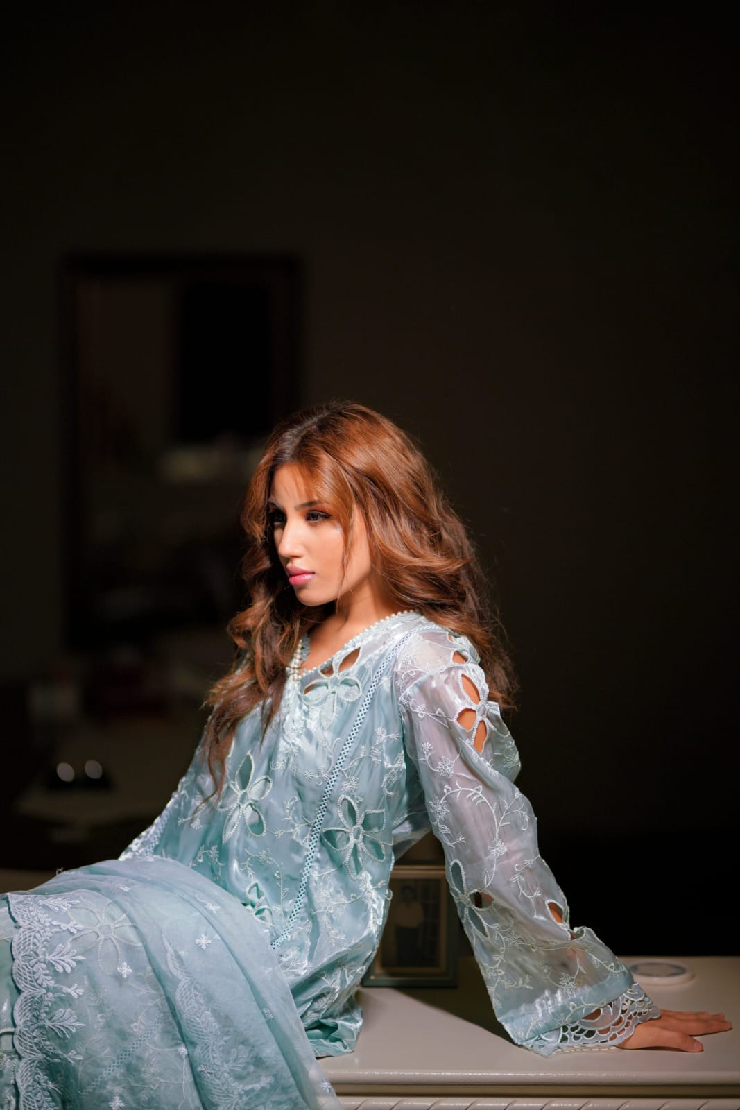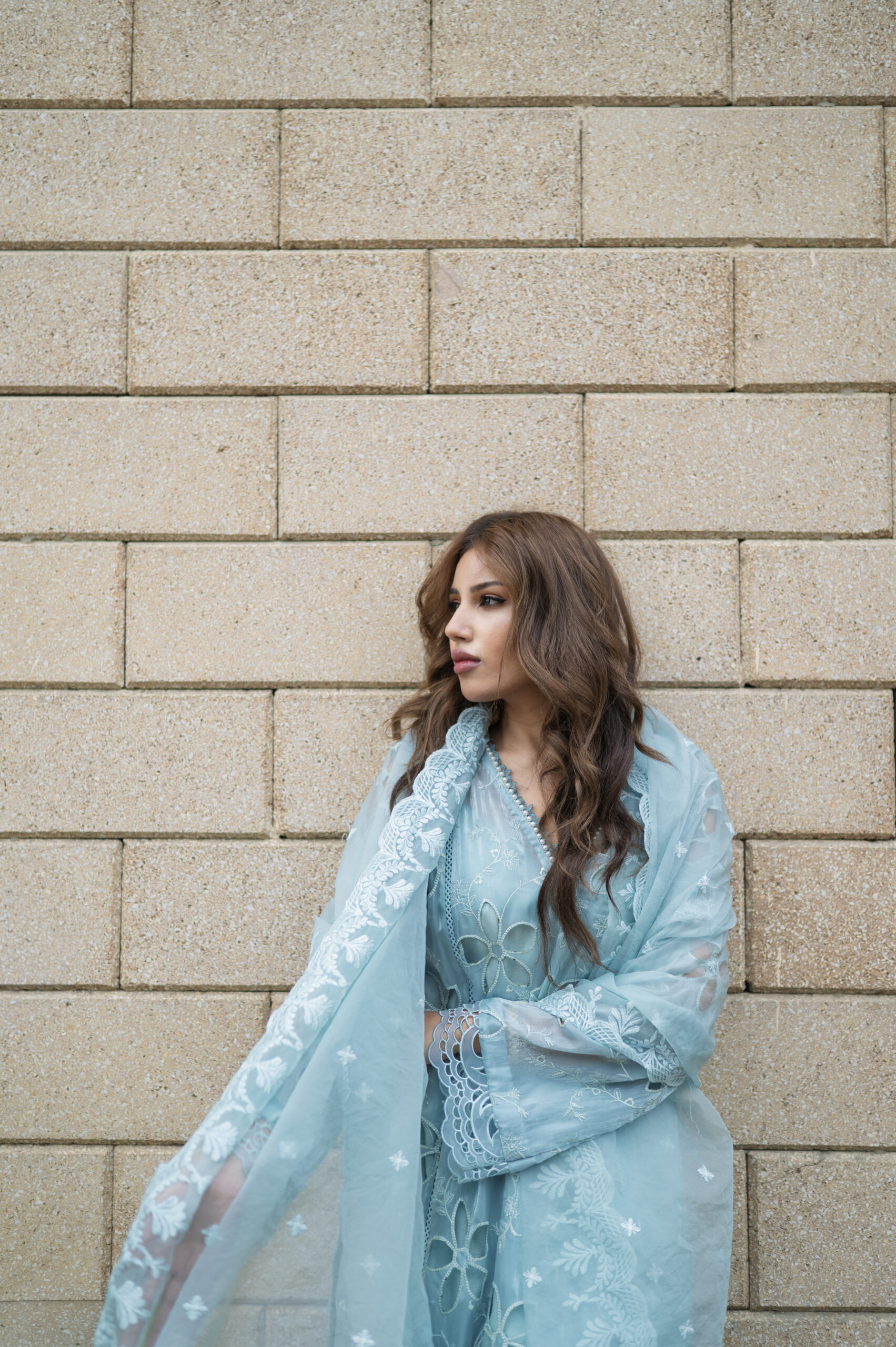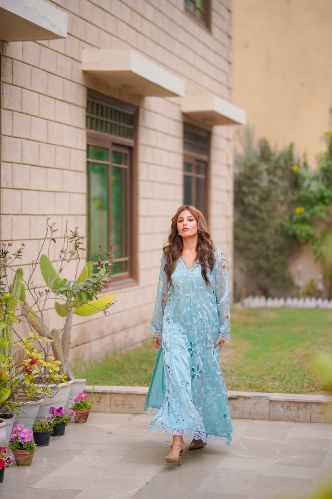Ice blue sheesha silk cut work A-line shirt with intricate lace details and a subtle pearl neckline. Paired with medium silk straight pants and a machine embroidery organza dupatta.